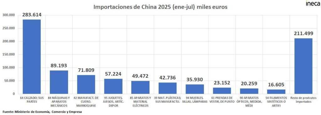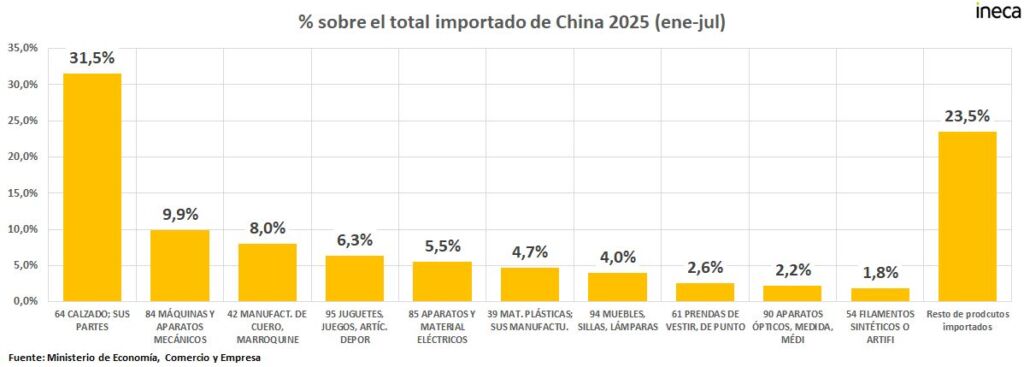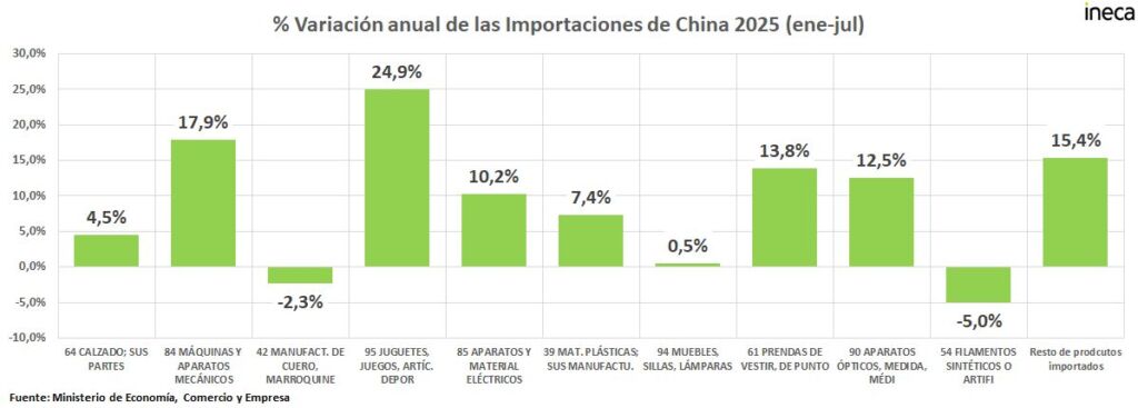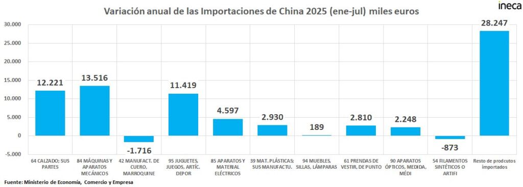 De este top 10 de productos importados, el calzado no es precisamente el que más aumenta, recoge un incremento anual del 4,5% y 12,2 millones de euros más de valor de importación que hace un año. El producto dentro de este top 10 que más ha incrementado las importaciones en términos relativos es el de juguetes y juegos con un ascenso del 24,9% y 11,4 millones más que en el 2024. Los productos del epígrafe Máquinas y aparatos mecánicos es dentro del top 10 el que más aumentó en términos absolutos, con un ascenso de 13,5 millones de euros más que hace un año. No obstante, las manufacturas de cuero y marroquinería han caído en 1,7 millones de euros.