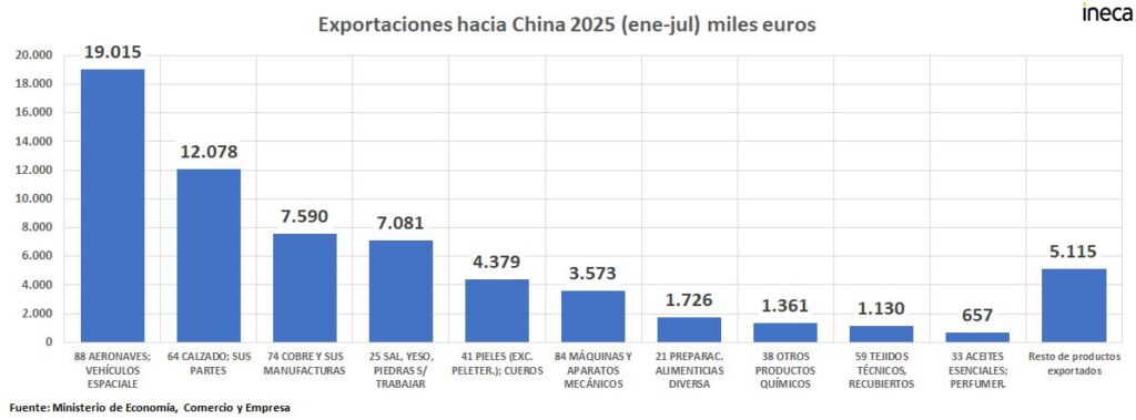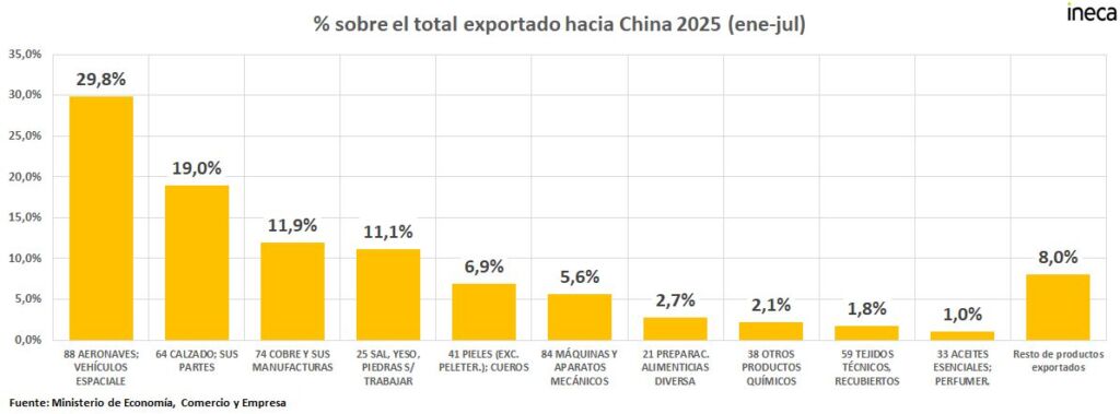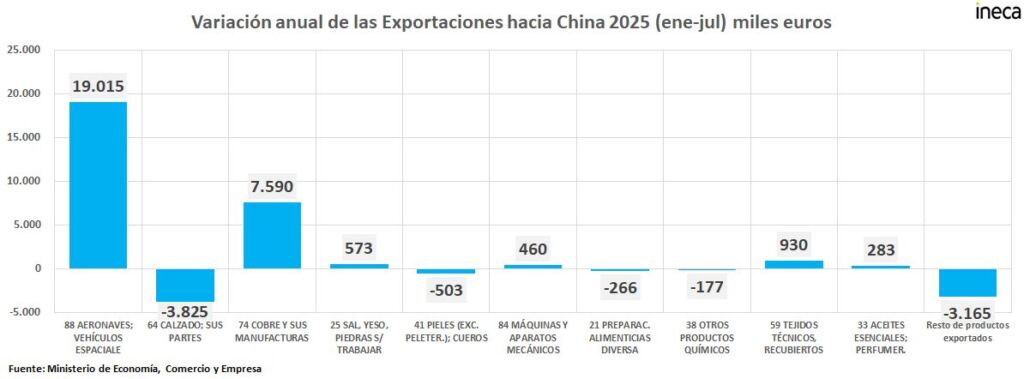 En lo que respecta a las exportaciones, destacan dos productos por encima de otros, ya que en 2024 no se produjeron ventas, como los mencionados helicópteros con 19 millones de euros y el cobre y las manufacturas con 7,5 millones de euros. Las exportaciones de calzado han descendido al igual que las pieles, las preparaciones alimenticias y otros productos químicos si se compara entre 2025 y 2024.