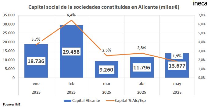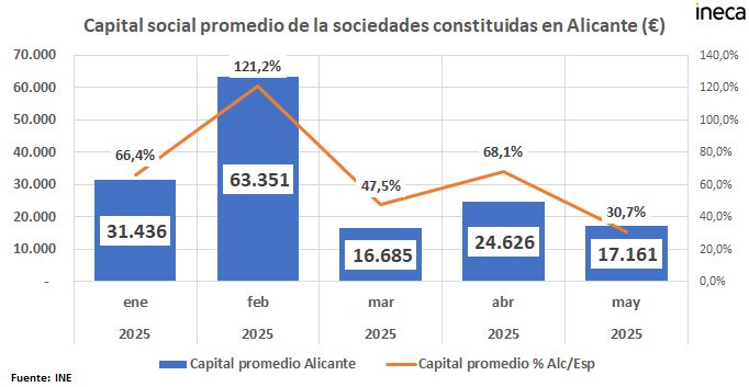 Globalmente, estas nuevas empresas han invertido 13,67 millones de euros en su capital social en mayo, un 15,9% más que en el mes de abril y más que en marzo. En general, las nuevas sociedades de la provincia de Alicante comienzan su andadura con un capital social muy inferior al promedio nacional, suponiendo sólo el 1,9% de España. Pero en 2025 el capital social total de las nuevas empresas ha sido muy irregular porque en febrero llegó casi a los 30 millones de euros, pero cayó en marzo a 9,2 millones y se recupera muy despacio en los siguientes dos meses (ver gráfico inferior).