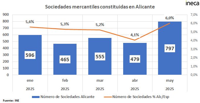 Durante el mes de mayo del 2025 se han constituido en la provincia de Alicante 797 sociedades mercantiles, un 66,4% más que en abril cuando sumaron 479 empresas nuevas y un 46,8% más que en el mismo mes de mayo del año anterior. Los datos han sido extraídos del Instituto Nacional de Estadística y han sido analizados por INECA para conocer el pulso emprendedor de la provincia.