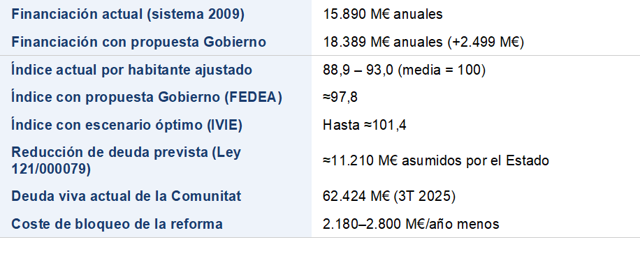 INECA reconoce que la propuesta de reforma del Gobierno, y el Proyecto de Ley Orgánica 121/000079, supone el primer movimiento real hacia la corrección de esta injusticia. Llopis indica que el análisis de FEDEA (De la Fuente, 2026) y del IVIE (Pérez, 2025) estima que la reforma generaría para la Comunitat Valenciana un incremento neto de aproximadamente 2.499 millones de euros anuales, elevando su índice de financiación desde el entorno del 89 hasta aproximadamente 97,8. En el escenario óptimo del IVIE, incorporando el reconocimiento del esfuerzo fiscal relativo, el índice podría alcanzar 101,4 y el incremento de recursos llegar hasta los 2.500 millones anuales.