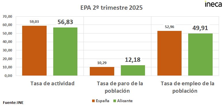 La EPA del segundo trimestre del 2025 recoge que la provincia de Alicante presenta una tasa de paro del 12,18%, superando en casi dos puntos porcentuales el dato nacional que es del 10,29%, según datos que ha hecho públicos hoy el INE y han sido recogidos por INECA. La provincia también presenta peores valores que el promedio nacional en tasa de actividad y tasa de empleo. Respectivamente, los valores para Alicante son 56,83% y 49,91%.