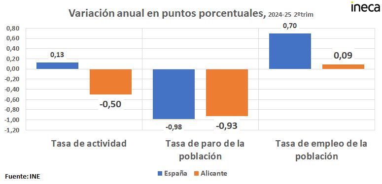 Aunque a priori no parecen buenas noticias, es importante destacar que la provincia de Alicante, respecto a los valores de hace un año, mejora la tasa de paro en -0,93 puntos porcentuales y la tasa de empleo en +0,09 puntos porcentuales, pero no es el caso de la tasa de actividad que cae -0,5 puntos porcentuales. Estas variaciones son inferiores a las registradas para el conjunto de España. La tasa de actividad en España mejora ligeramente con 0,13 puntos porcentuales y la tasa de empleo crece en España con 0,70 puntos frente a los 0,09 puntos porcentuales de la provincia.